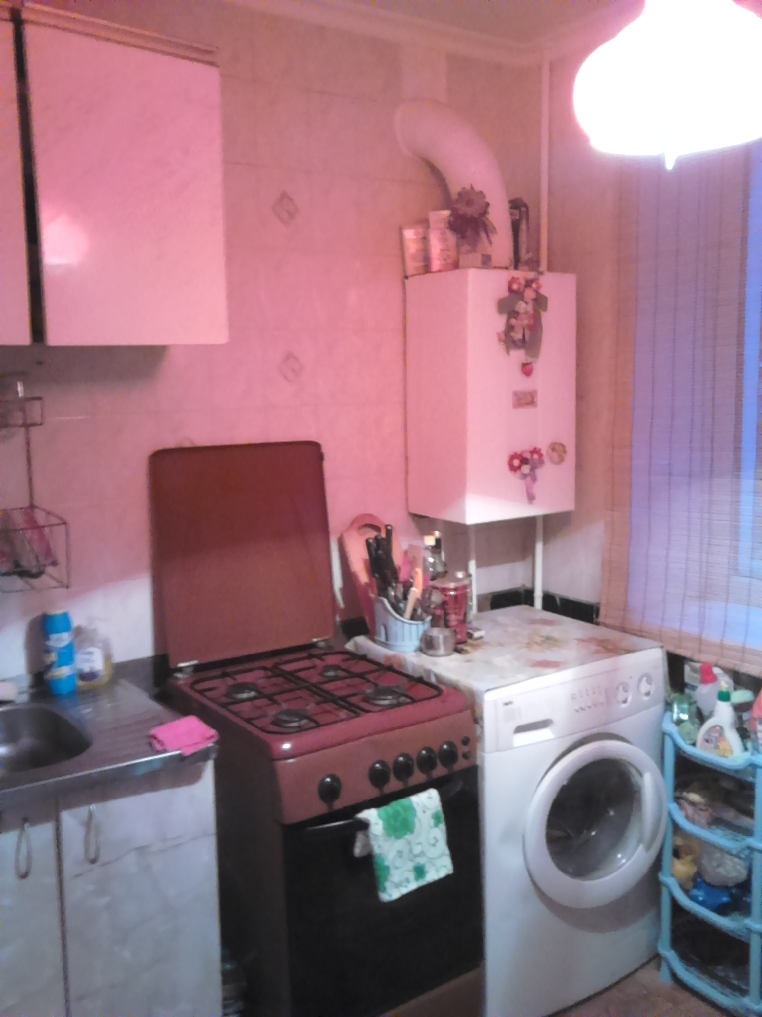 В кухне газовая плита, духовка, и домашняя утварь: чайник,