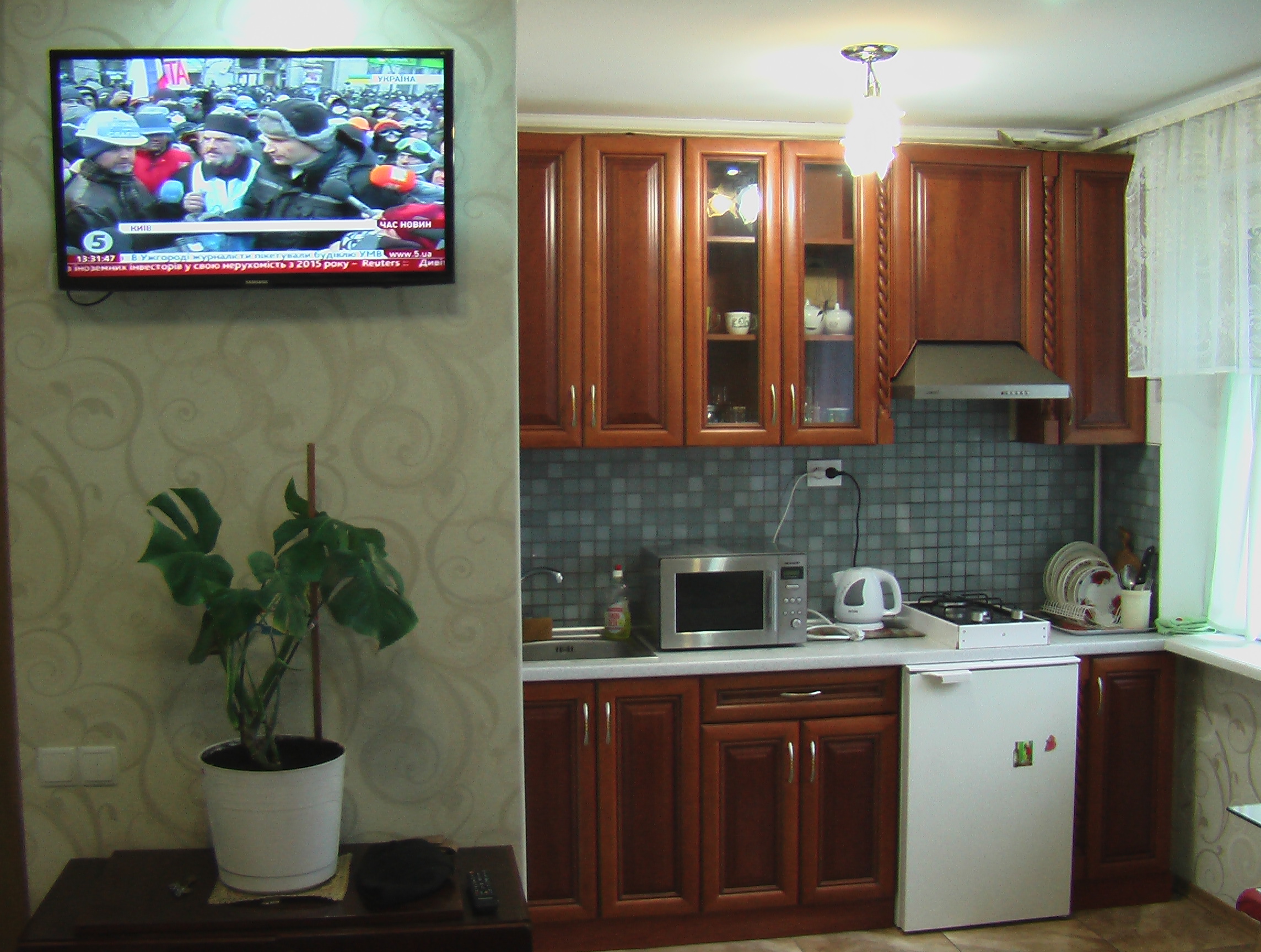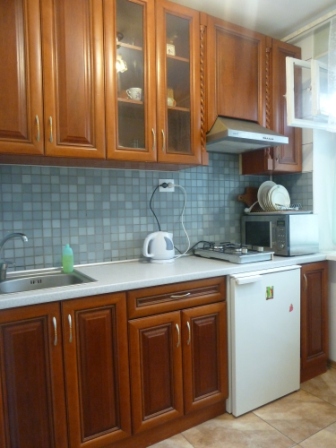В кухне газовая плита, духовка, микроволновая печь, холодильник, чайник, кастрюли, тарелки, стаканы, ложки, вилки, и т.д.,