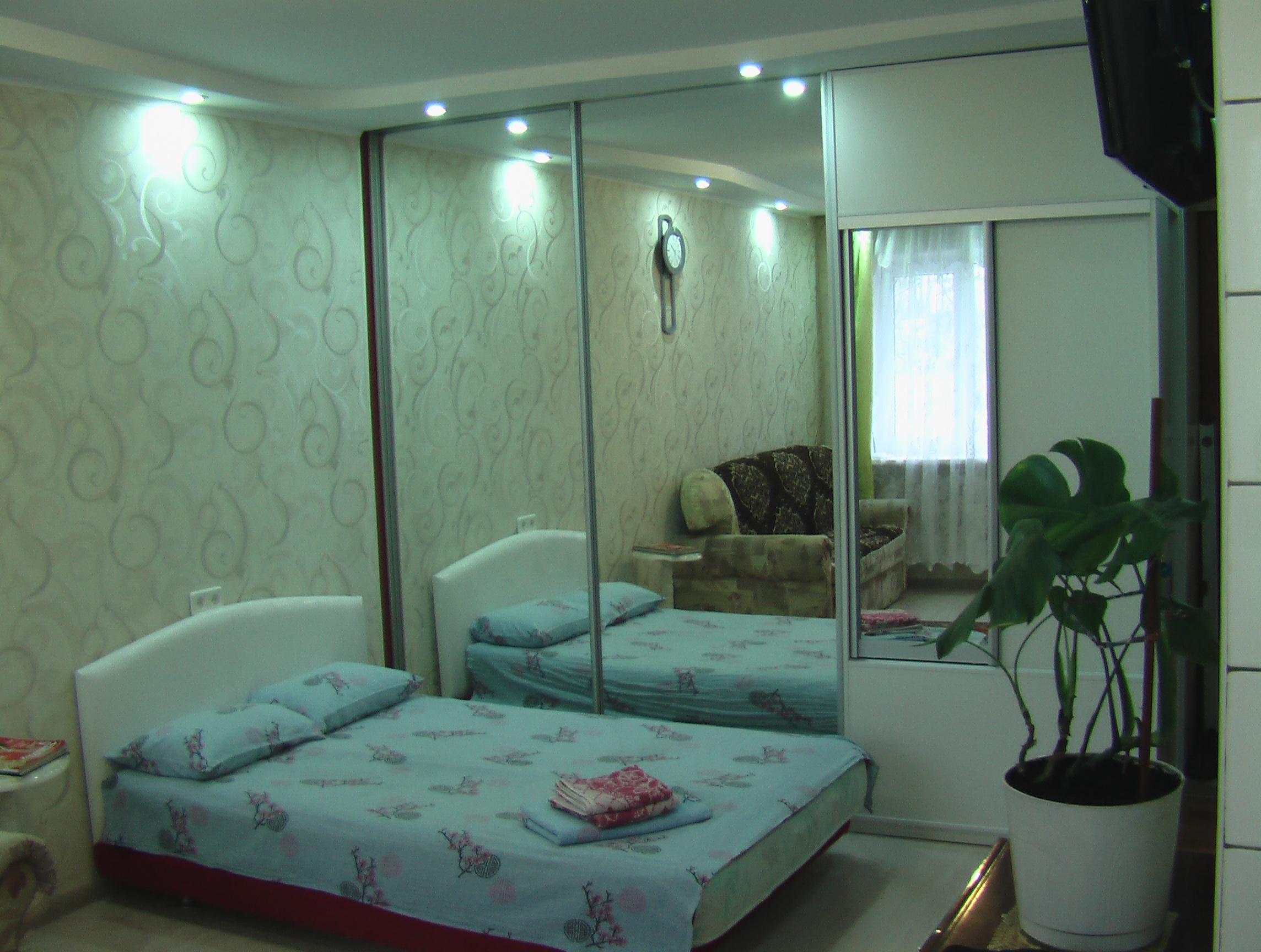Спальных мест 4, (2+2), двуспальная кровать и двухспальный диван.
