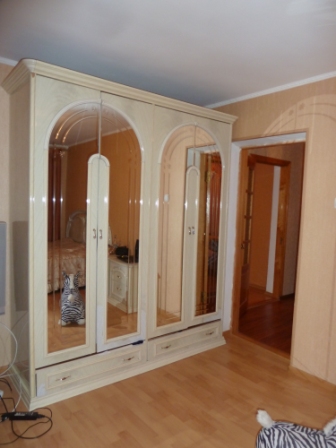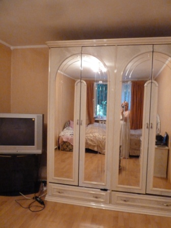 В кухне студии стоит двуспальный диван, газовая плита, духовка, микроволновка.